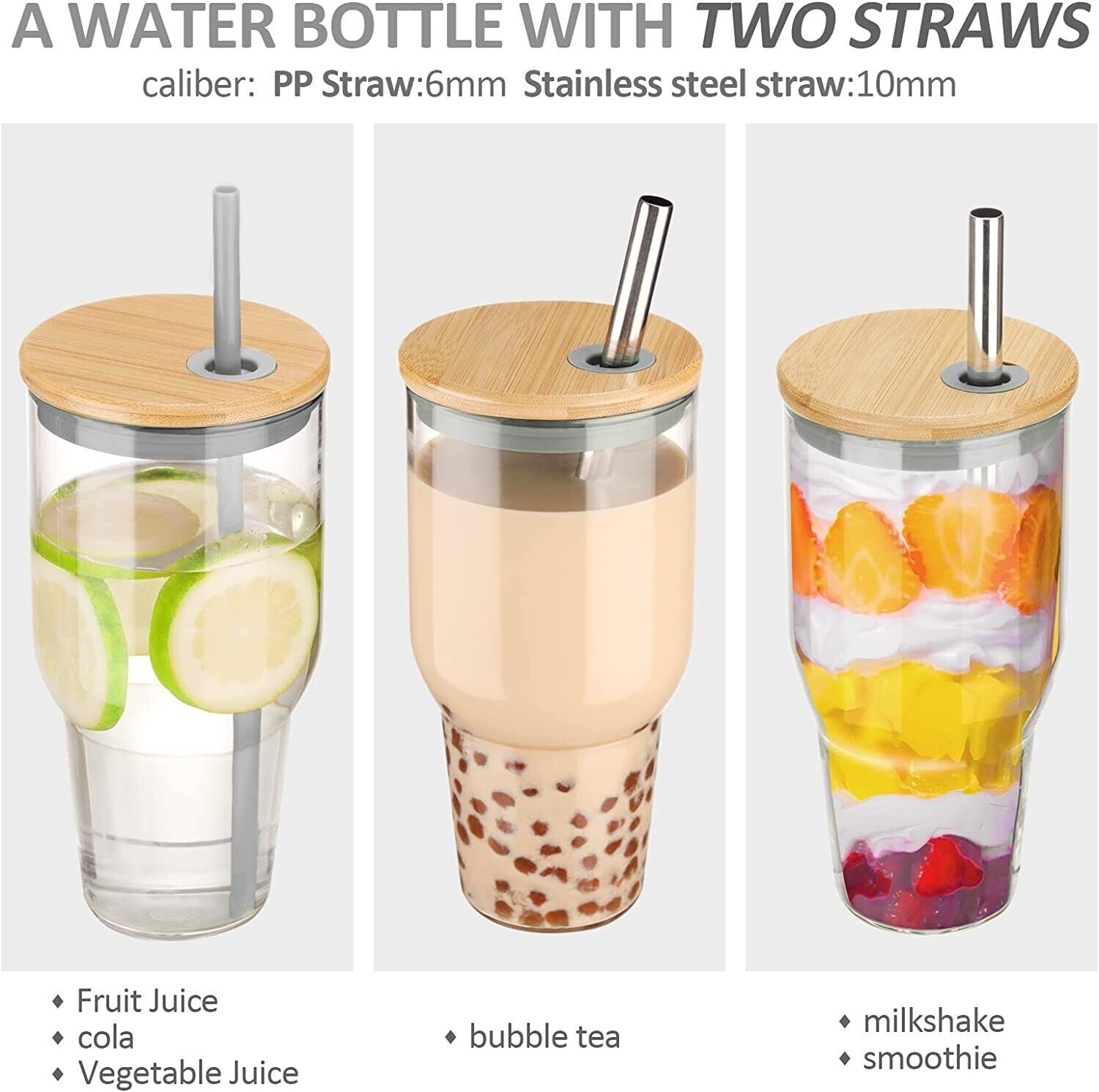 32oz Glass Tumbler with Straw and Lid, Reusable Boba Smoothie Cup (Gray)