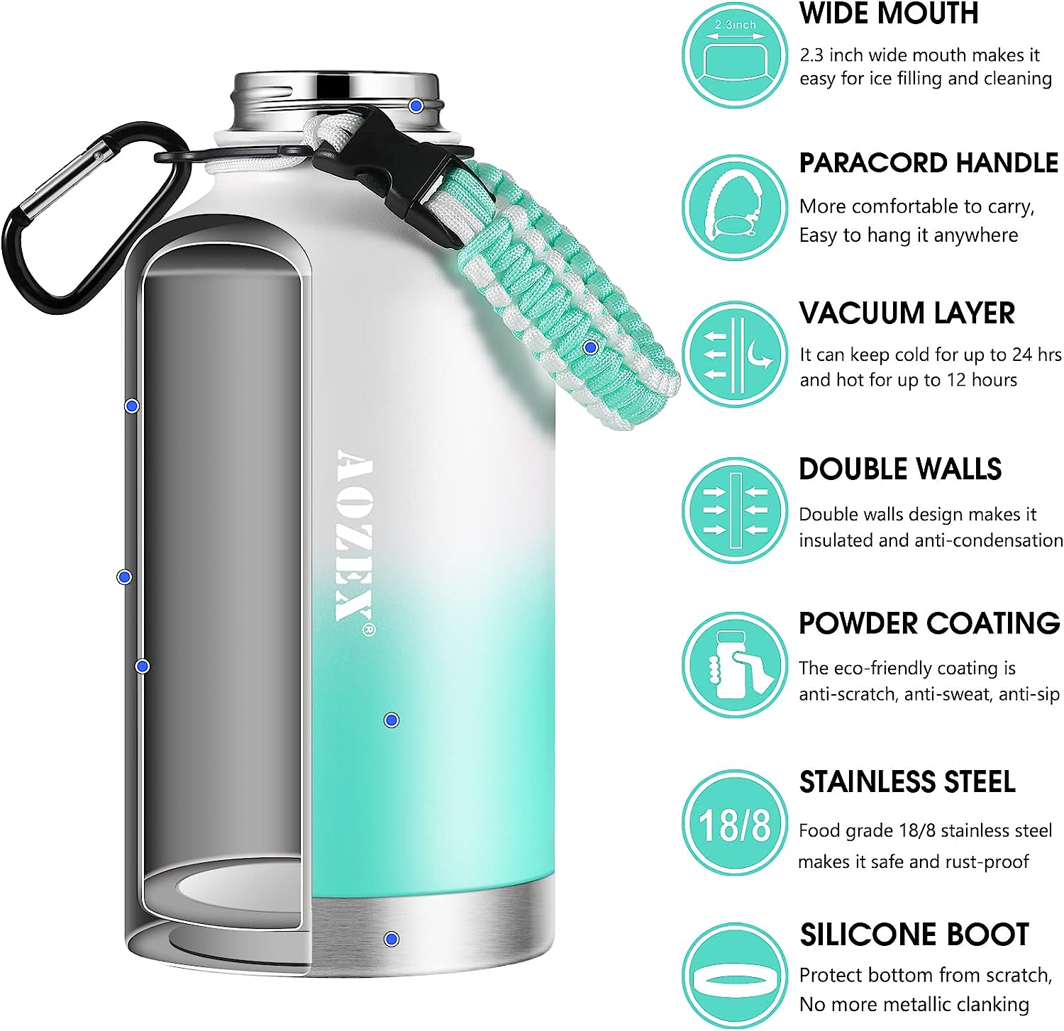 64 OZ Insulated Water Bottle with Straw, Stainless Steel Half Gallon Large Water