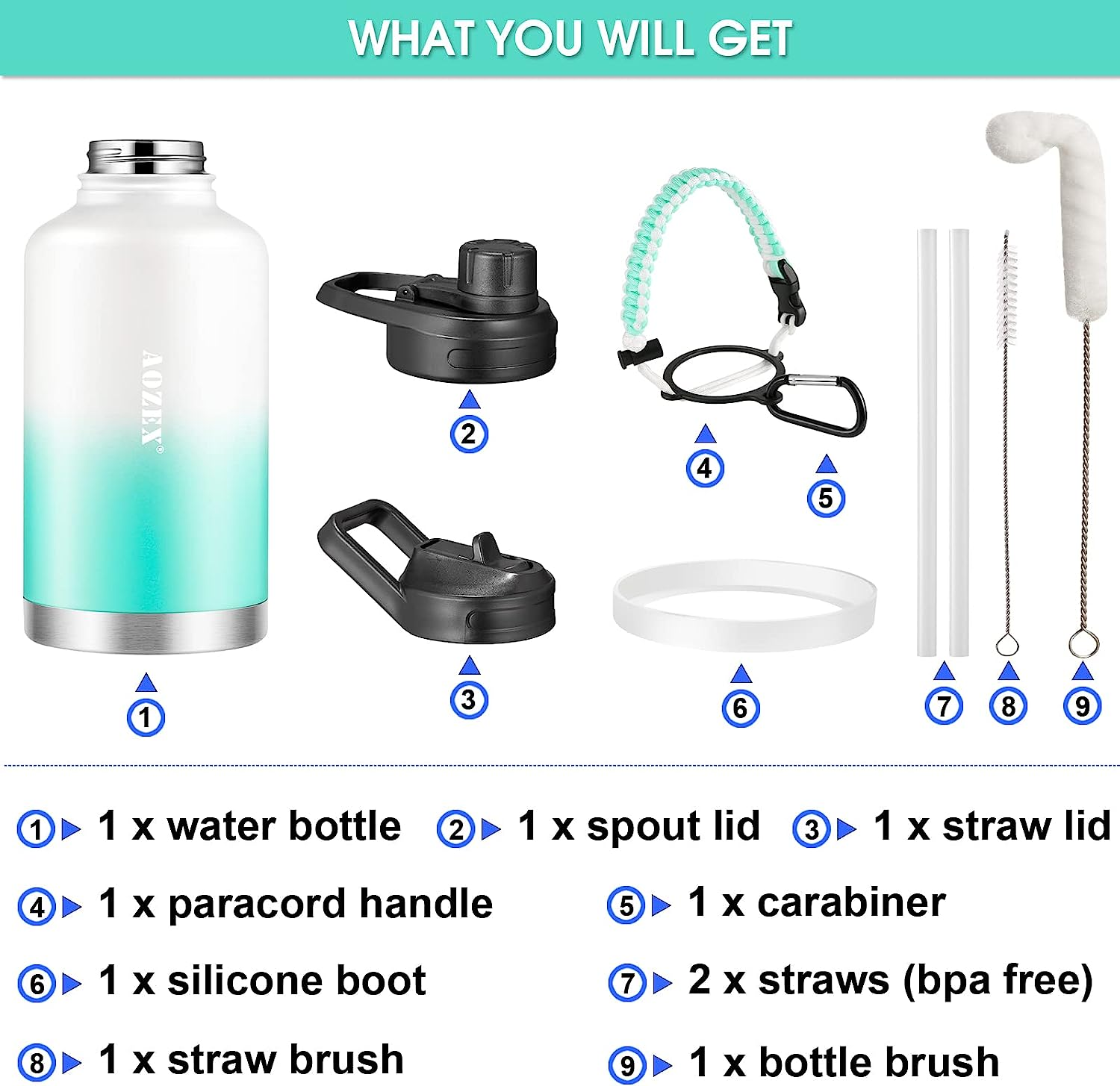 1xBottle Brush, 1xCarabiner, 1xBottle, 2xLids, 1xParacord handle,