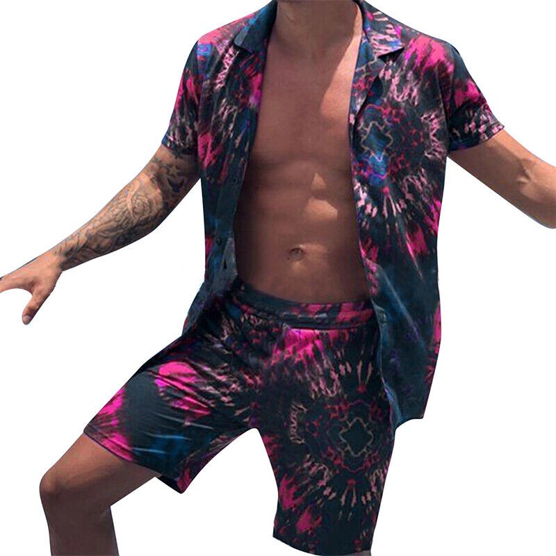 Men's Summer Hawaii Outfits Short Sleeve Shirts +Shorts Casual Beach 2Pcs Sets